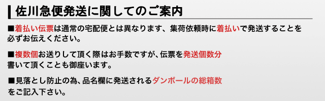 佐川急便営業所に持ち込んでいただくことで、佐川急便宅配便の着払いでお送りいただくこともできます。